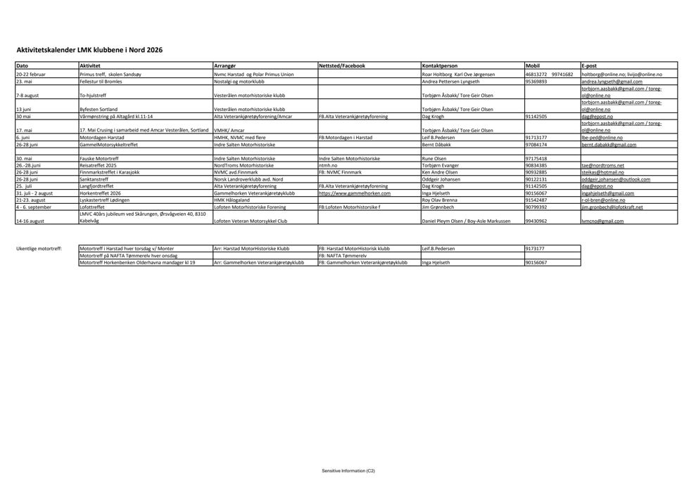 Aktivitetskalender LMK klubbene i Nord 2026